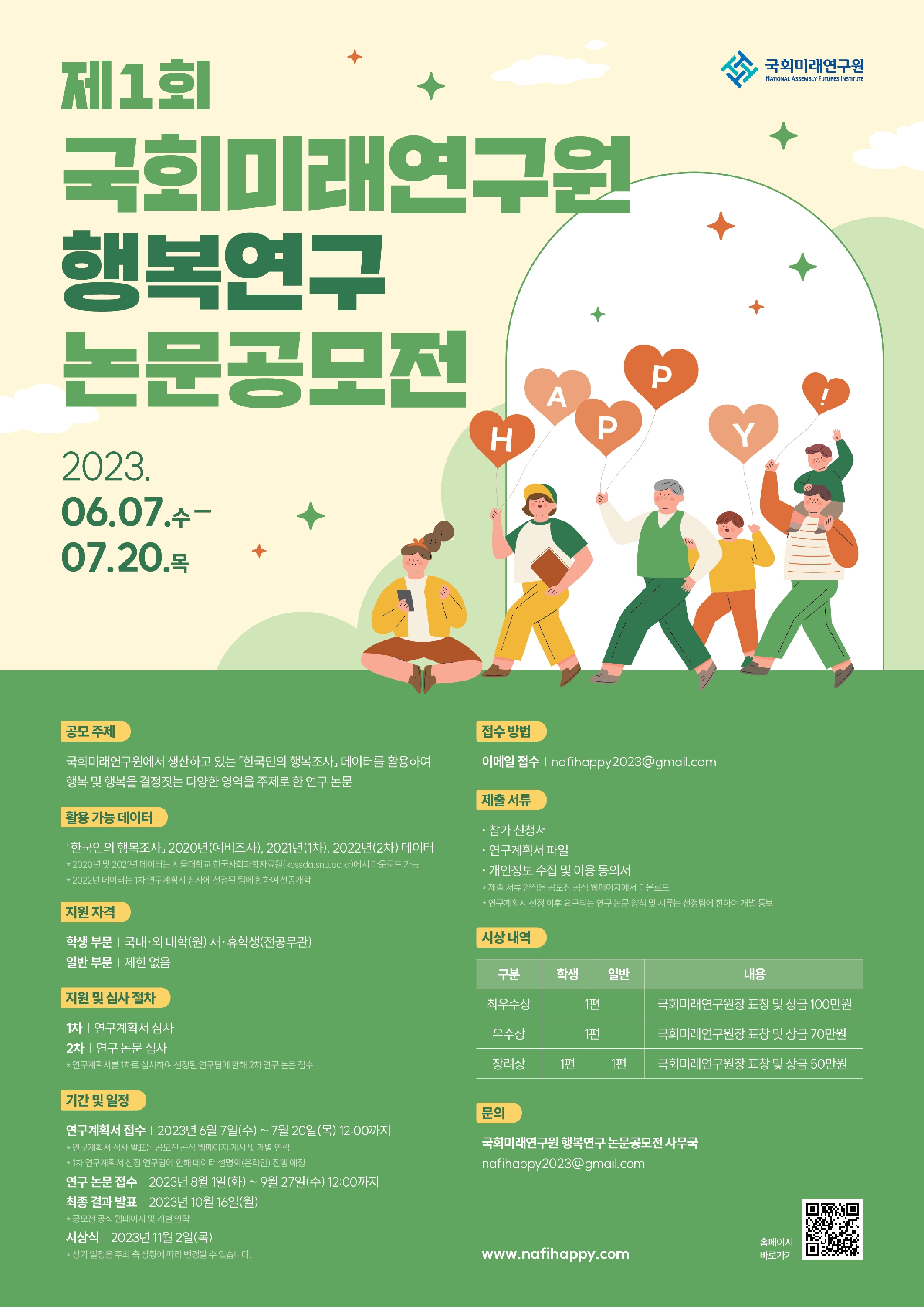 | 제목 | 제1회 국회미래연구원 행복연구논문 공모전 안내 | 날짜 | 2023-06-19 | 조회수 | 1731 |
