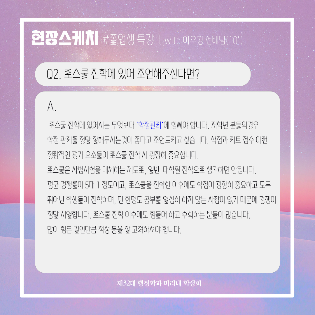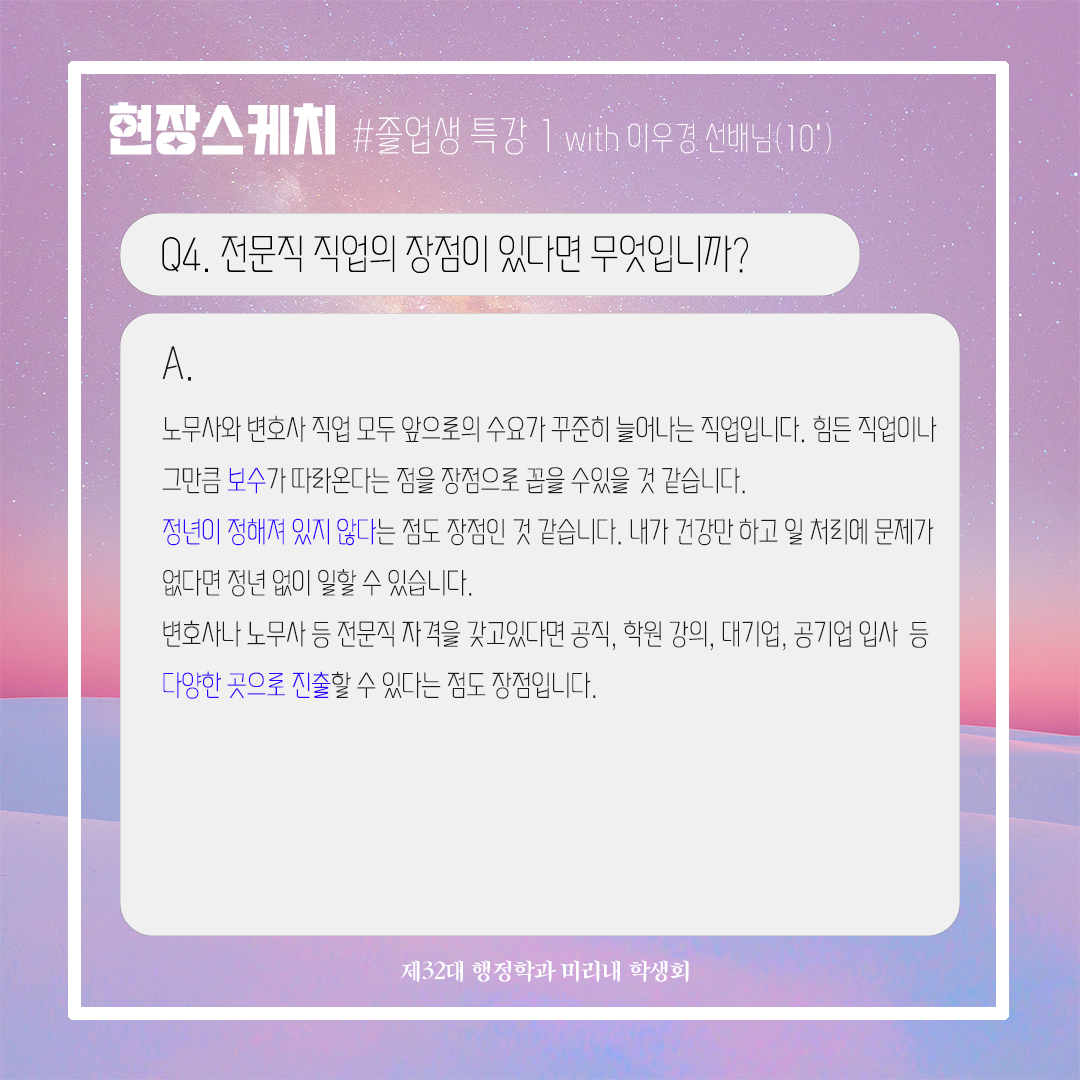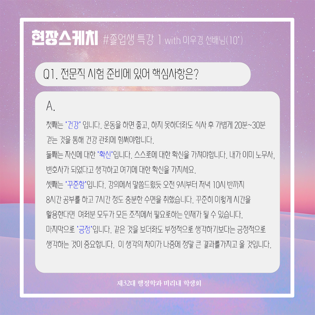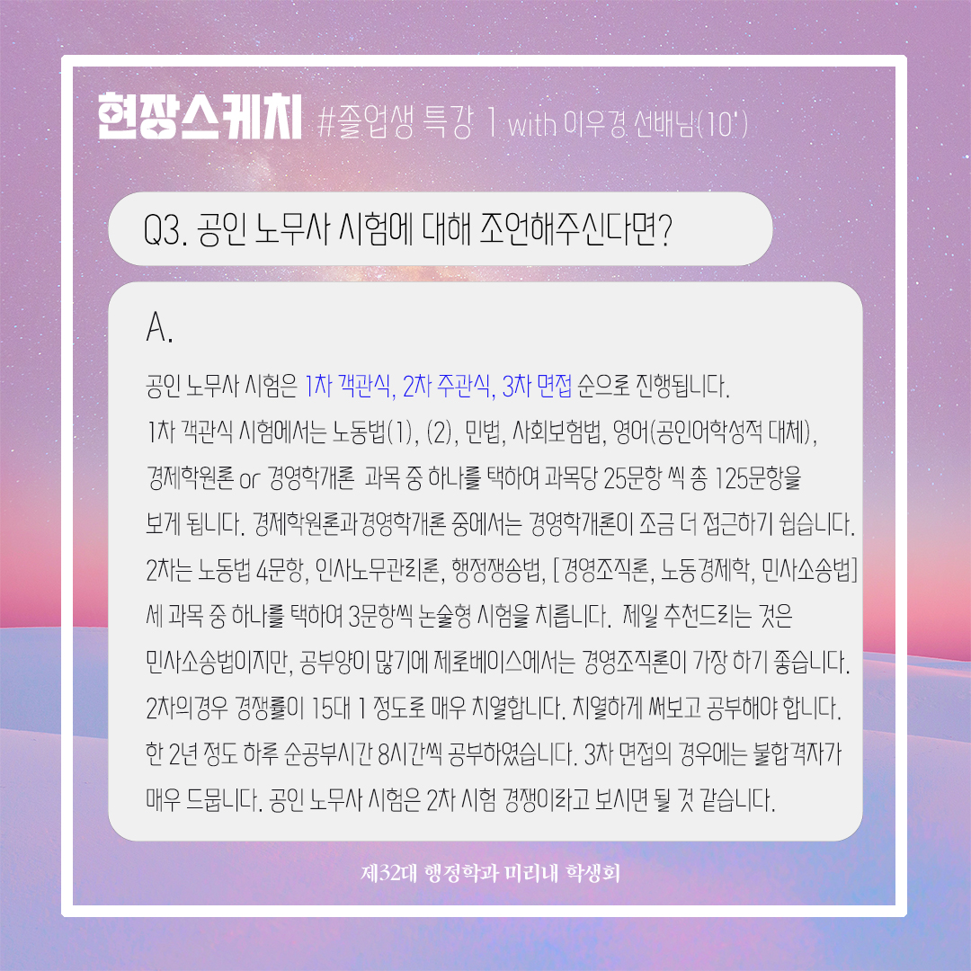 지난 11월 3일(금), 제32대 미리내 학생회에서 주최한 졸업생 특강이 많은 학생들의 관심 덕분에 잘 끝마치게 되었습니다. 이번 졸업생 특강은 행정학과 10학번 이우경 선배님께서 귀한 시간을 내어 참석해주셨고, 현직에서의 경험과 전문직 시험을 준비하는 학생들에게 도움이 되는 특강을 해주셨습니다. 학생회에서 부득이하게 참석하지 못한 학생들을 위해 이번 특강의 후기를 준비했으니 참고하시기 바랍니다. 후배들을 위해 시간내어주신 이우경 선배님께 감사드리고, 졸업생 특강을 준비해 준 미리내 학생회 여러분 수고 많으셨습니다. :) * 특강자료 첨부
