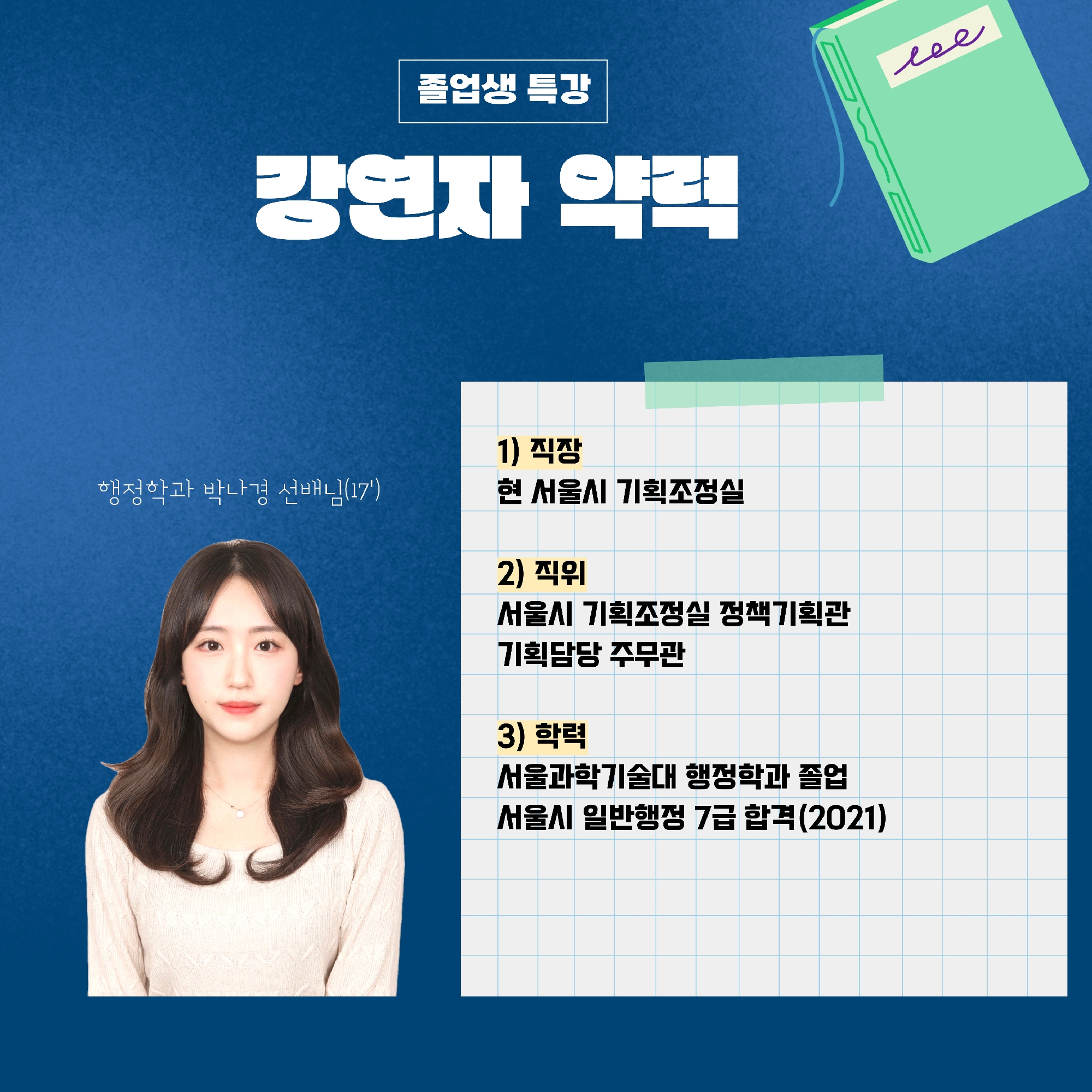 행정학과 학생회에서 지난 11월 2일 첫 번째 졸업생 특강(전문직 - 10 이우경 선배님)에 이어 현재 공무원으로 재직 중이신 선배님을 초청하여 졸업생 특강 두 번째 시간을 마련하였습니다. 공직 진출에 관심있는 학생들에게는 의미있는 시간을 될 이번 특강에 많은 참여 바랍니다.
