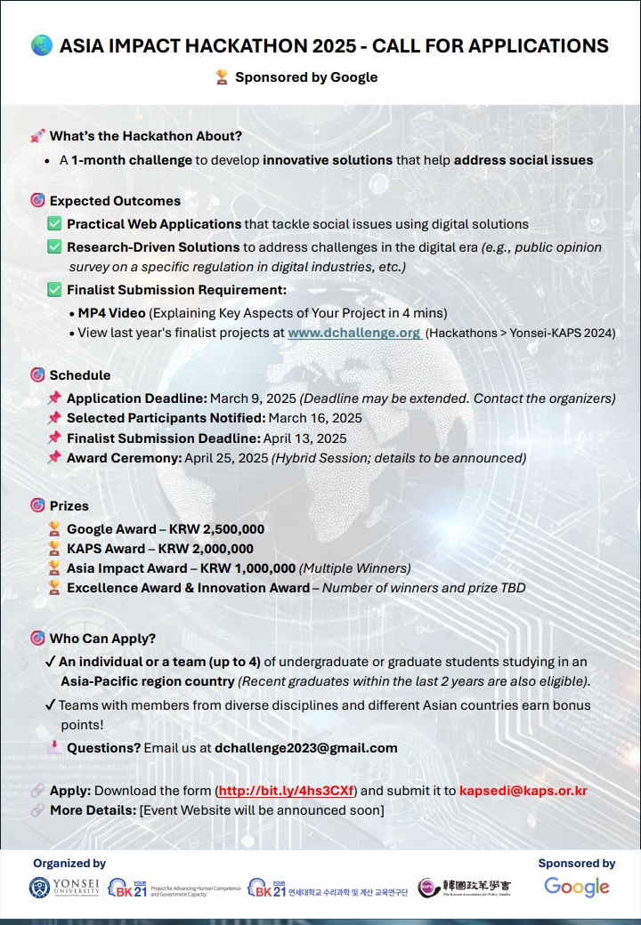 | 제목 | [한국정책학회] 사회문제 해결을 위한 해커톤 참가 안내(~3/9) | 날짜 | 2025-02-11 | 조회수 | 1028 |