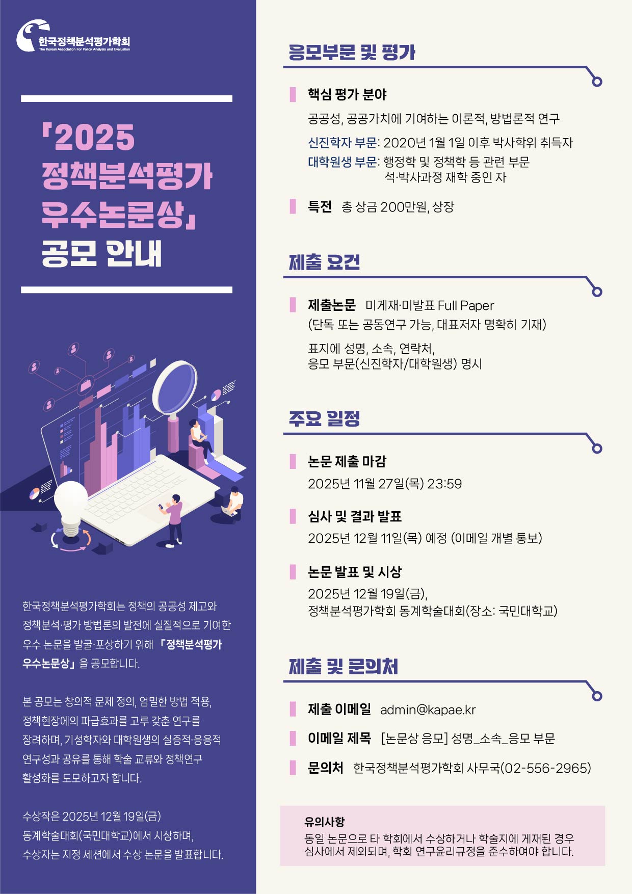 제목 | [한국정책평가분석학회] 2025 정책분석평가 우수논문상 공모 안내 | ||||