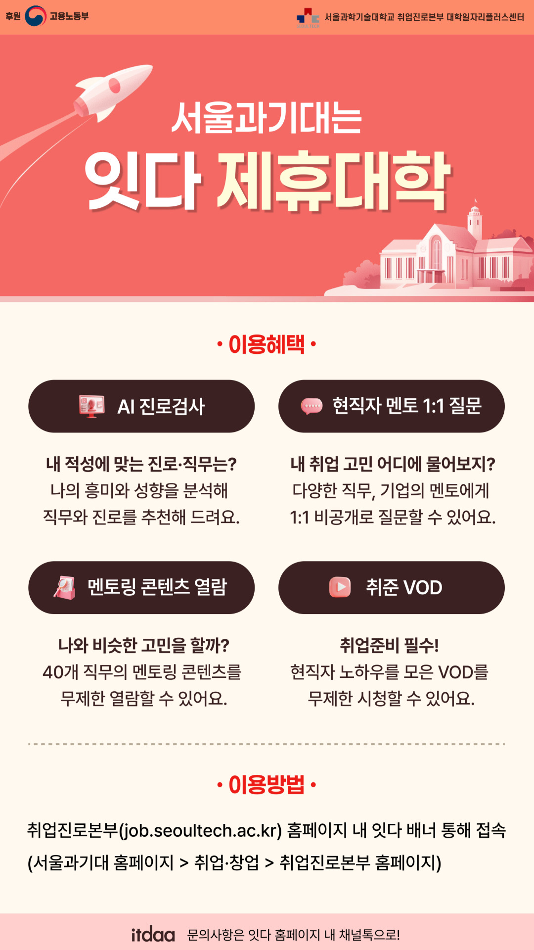 취업진로본부에서는 재학생과 졸업생의 취업준비에 도움을 드리기 위해 온라인 제휴 서비스를 제공하고 있습니다. ‘잇다’는 다양한 산업·기업·직무에 종사 중인 현직자 멘토와 직접 소통할 수 있는 플랫폼으로, AI 진로검사, 현직자 멘토 1:1 질문, 멘토링 콘텐츠 열람, 취준 VOD 시청 등을 통해 실질적인 도움을 받을 수 있습니다. 이용 기간 연중 상시